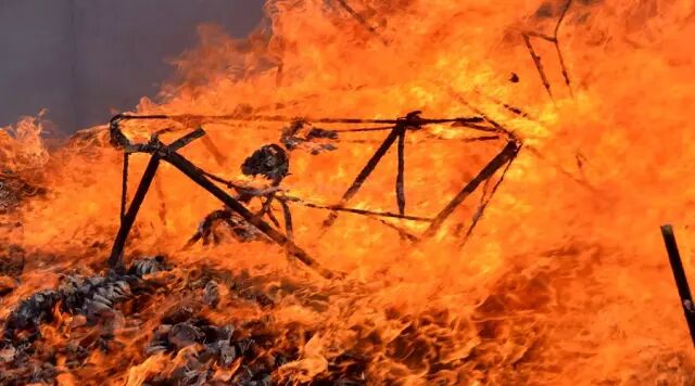 等到队伍到齐后,所有超度牌位都放到西方船上,三师和尚在镇坛大将军面前唱诵一番,看起来就像正在做最后的交代,希望镇坛大将军可以护持西方船上的所有亡灵,令大家都顺利往生西方。“上来修建法界圣凡水陆普度大斋胜会道场,良宵圆满,奉迎圣驾,暂住佛殿,大众一心,念佛引导。”接着焚化所有廿四席牌位,然后,将镇坛大将军安放到船首,大众起腔念佛,在平静沉稳的佛号声中,由义工点燃西方船,鸣放鞭炮,大火一下就燃烧开来,强烈的热气把镇坛大将军手上印有“慈航普度”及“镇守坛前”的旙吹得直冲天上,心中默默祝福所有亡灵都顺利往生西方极乐世界。短短几分钟念佛期间,望着逐渐化为灰烬的西方船,一时繁华归于寂灭。